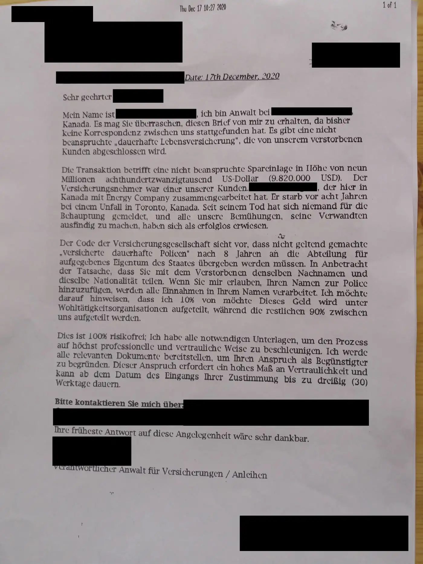 Weil der Erblasser in Kanada keine Erben hinterlassen habe, hätte der Anwalt einen Suchauftrag nach möglichen Erben gemacht und so unseren Kunden gefunden. Schließlich möchte er das viele Geld einem rechtmäßigen Erben zuführen.