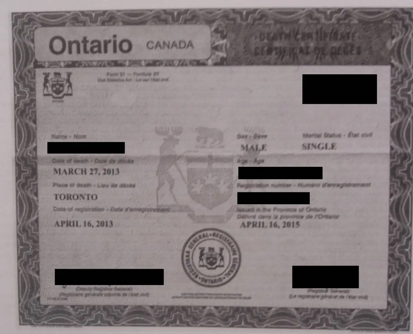 Unsere Detektive recherchierten in Toronto und kümmerten sich zunächst um die Sterbeurkunde. Diese Sterbeurkunde kann ein Detektiv vor Ort anhand des Aktenzeichens einsehen und sehen, ob sie inhaltlich mit der übersandten übereinstimmt.